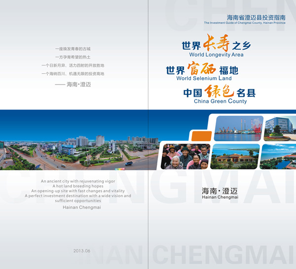《世界长寿之乡——澄迈》投资指南采用中英文混排,内容图文并茂,详细介绍了澄迈县的历史、现状和未来规划,重点展示澄迈县的招商项目和发展前景。《世界长寿之乡——澄迈》电视宣传片真实、大气,采用中文解说、中英文字幕,向观众展示了一个生机勃勃的澄迈县。