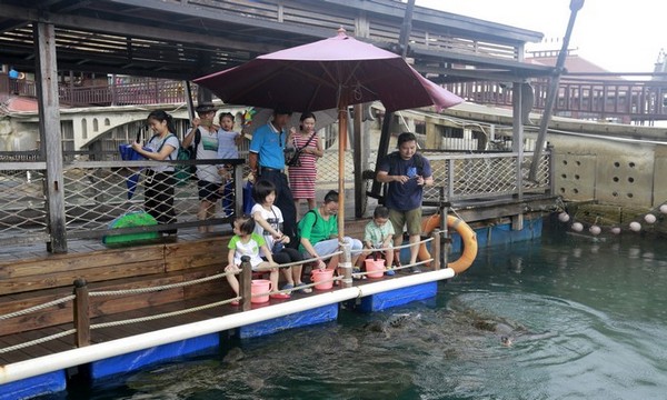 海狮、海豚表演半个小时,快乐时光总是觉得时间过得非常快,觉得还没有过瘾,表演就已经结束了。幸好,孩子们还有别的可玩的,那就是喂海豚的乐趣。沈青一家,芳姐一家,傅姐一家,高姐一家,郑重一家,小石一家,买食物让孩子们欢天喜地去喂海豚。